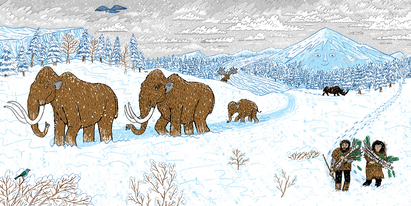 A selection of pages from a silent picture book telling the story of a mountain and all that they see during their life.